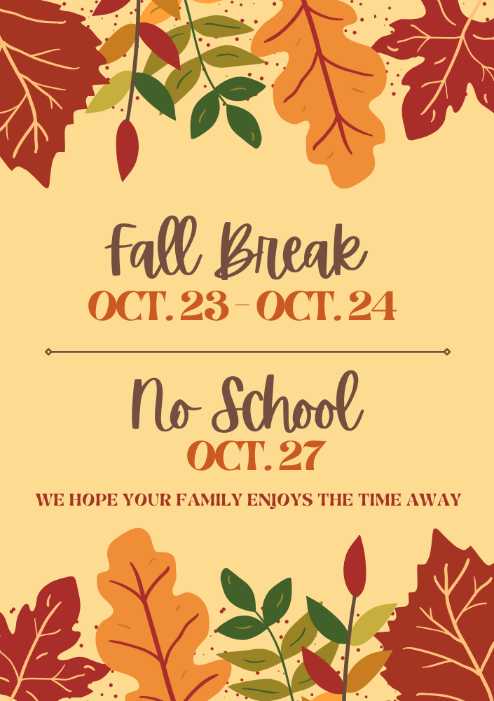 Fall Break will be from Oct. 23 – Oct. 24.